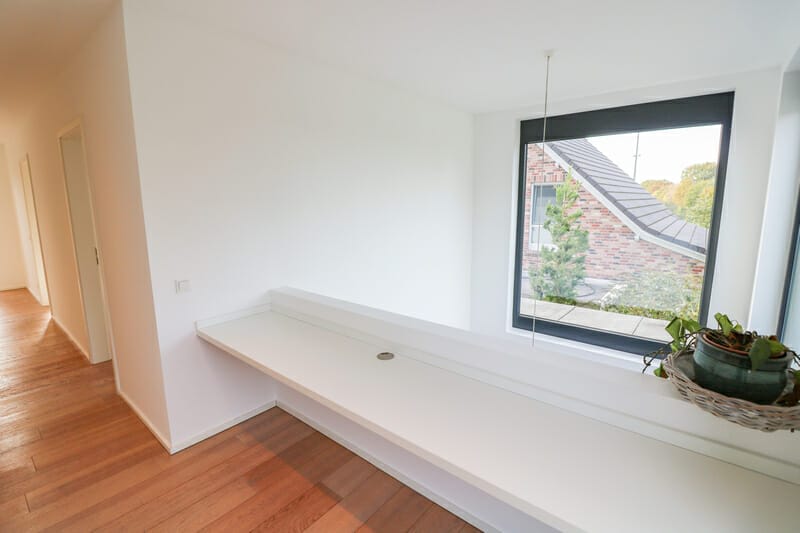 Auf der ersten Wohnebene befinden sich neben dem zentralen Wohn-, Koch- und Essbereich zusätzlich ein Gäste-WC inklusive Dusche, ein Vorrats- und Abstellraum sowie der Zugang zum großzügigen Garten. Über die Treppe gelangen Sie auf die Ebene mit dem Hauptschlafzimmer nebst großer Ankleide, den beiden Kinderzimmern, dem Badezimmer mit Dusche und Badewanne sowie der lichtdurchfluteten Galerie mit dem Zugang auf den rund 12 m² großen Balkon. Energetisch und technisch präsentiert sich dieses Haus wie neu, es wurde erst im Jahr 2014 gebaut. Die moderne Technik und die hochwertige, monolithische Bauweise erlauben sehr niedrige Verbrauchskosten. Die moderne und hochwertige Ausstattung lässt keine Wünsche offen. Das Anwesen liegt in begehrtester Lage mit Blick auf den Wesel-Datteln-Kanal und den Lippeauen.